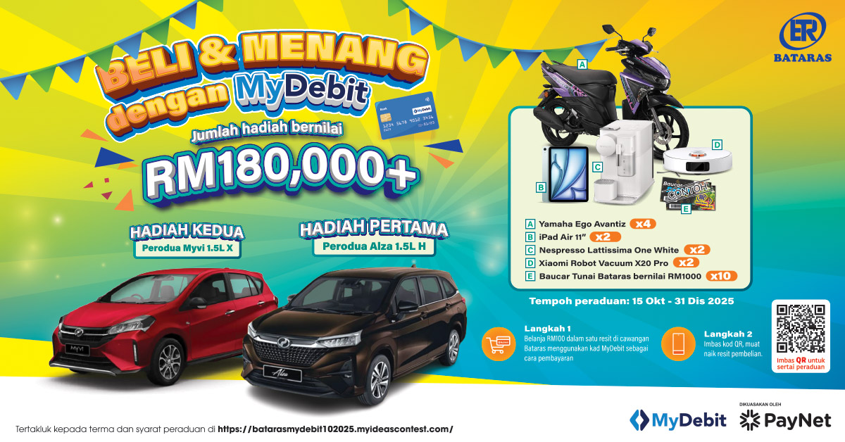 2. A minimum purchase of RM100 and above at all Bataras outlets in a single receipt/transaction using MyDebit card (via contactless transaction or PIN) as the payment method (with a clearly printed receipt slip), will be eligible for a maximum of one (1) entry per receipt (“Proof of Purchase”).